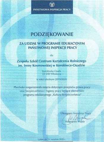 W grudniu 2020r. czterech nauczycieli otrzymało świadectwa uczestnictwa w Ogólnopolskim Programie Edukacyjnym Państwowej Inspekcji Pracy. Nauczyciele otrzymali świadectwa za przeprowadzenie zajęć z zakresu przepisów prawa pracy oraz bezpieczeństwa i higieny pracy, będących elementem programu.