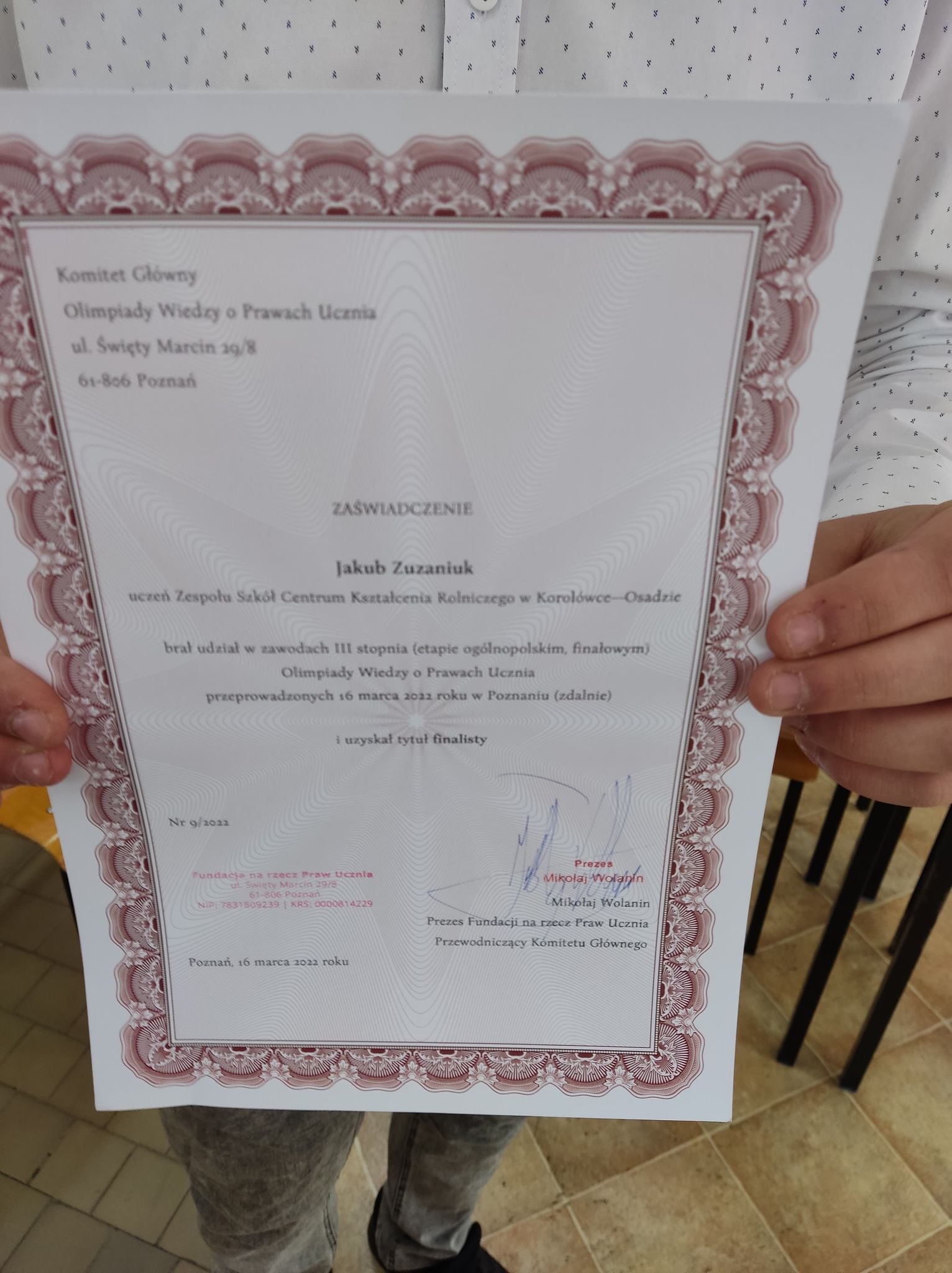uzyskał tytuł finalisty biorąc udział w zawodach III stopnia na etapie ogólnopolskim, finałowym Olimpiady Wiedzy o Prawach Ucznia.