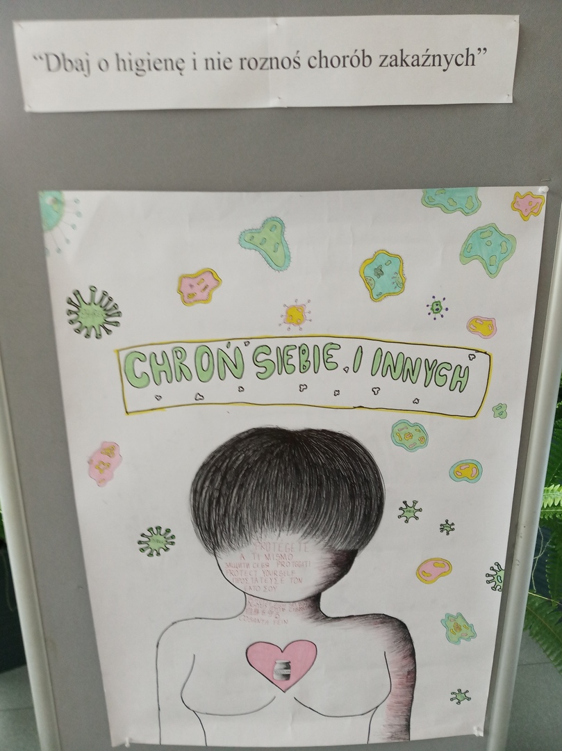Uwieńczeniem tygodnia była wystawa prac plastycznych wykonanych przez uczniów, zatytułowana "Dbaj o higienę i nie roznoś chorób zakaźnych", jak napisał jeden z naszych uczniów.