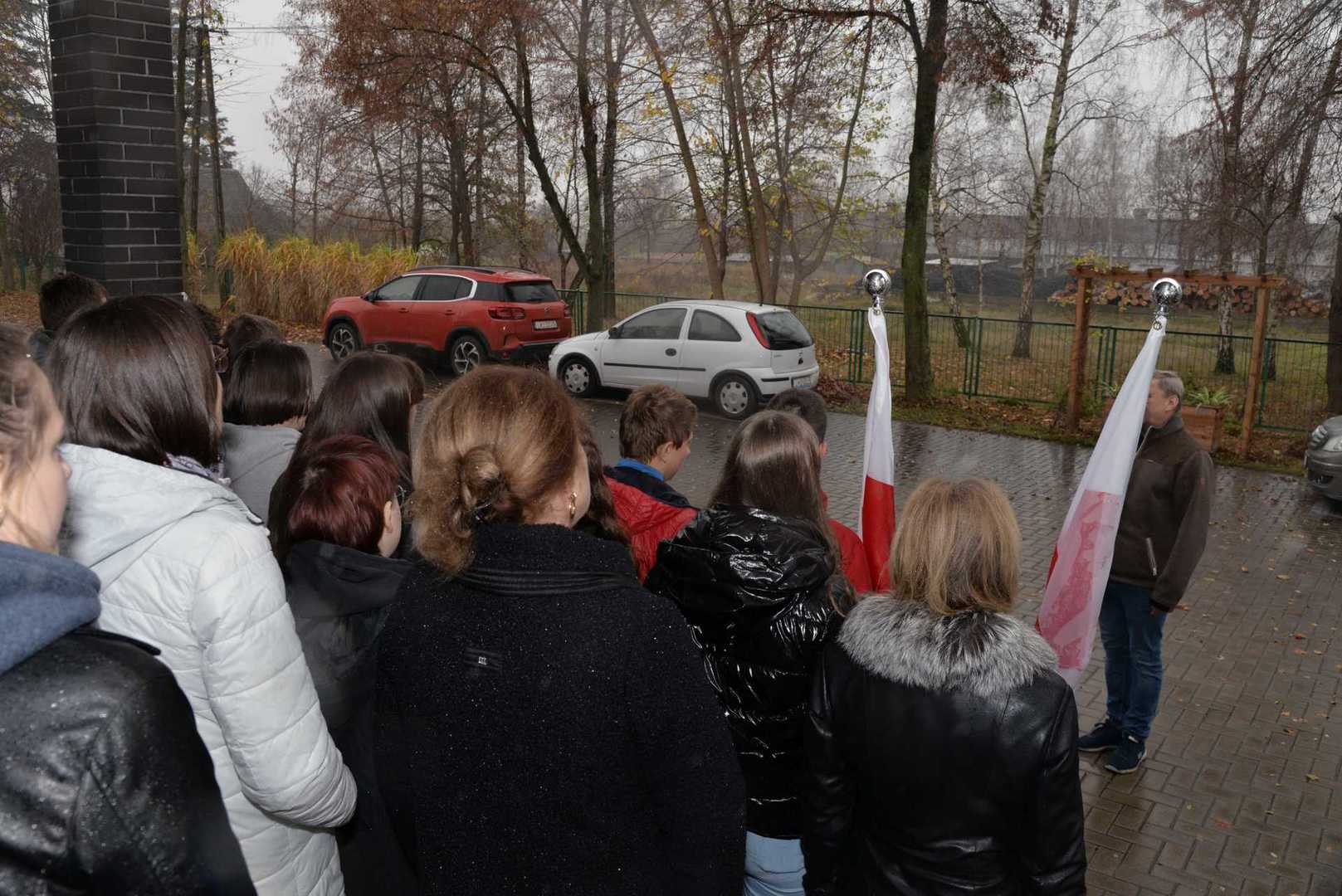 Jednak deszcz zmienił nasze plany i odśpiewano hymn przy głównym wejściu do szkoły.