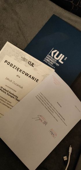 W dniu 12 stycznia 2023 r. Jakub Zuzaniuk uczeń klasy IV MT, wziął udział i uzyskał tytuł laureata w IV Edycji Konkursu o Polsce Europie i Świecie. Współorganizatorami konkursu oprócz pracowników Instytutu Nauk o Polityce i Administracji były Koło Naukowe Stosunków Międzynarodowych KUL oraz koło Naukowe Bezpieczeństwa Narodowego KUL. Głównymi nagrodami były indeksy na dwa kierunki: Stosunki międzynarodowe i Bezpieczeństwo narodowe. Istotne, iż to przyszły student sam wybiera indeks na jednym z kierunków, który chce w przyszłości studiować. Warto podkreśli, że wykształcenie w tym zakresie daje dużo możliwości, jeśli chodzi o przyszłe zatrudnienie. Studia są jednym z najważniejszych momentów w życiu, dają możliwość rozwoju, nabywania dodatkowych doświadczeń, zdobywania nowych kompetencji społecznych i kulturowych. To nie tylko czas wytężonej pracy, ale i zabawy oraz poznawania nowych przyjaciół. Gratulujemy Jakubowi i życzymy dalszych sukcesów......