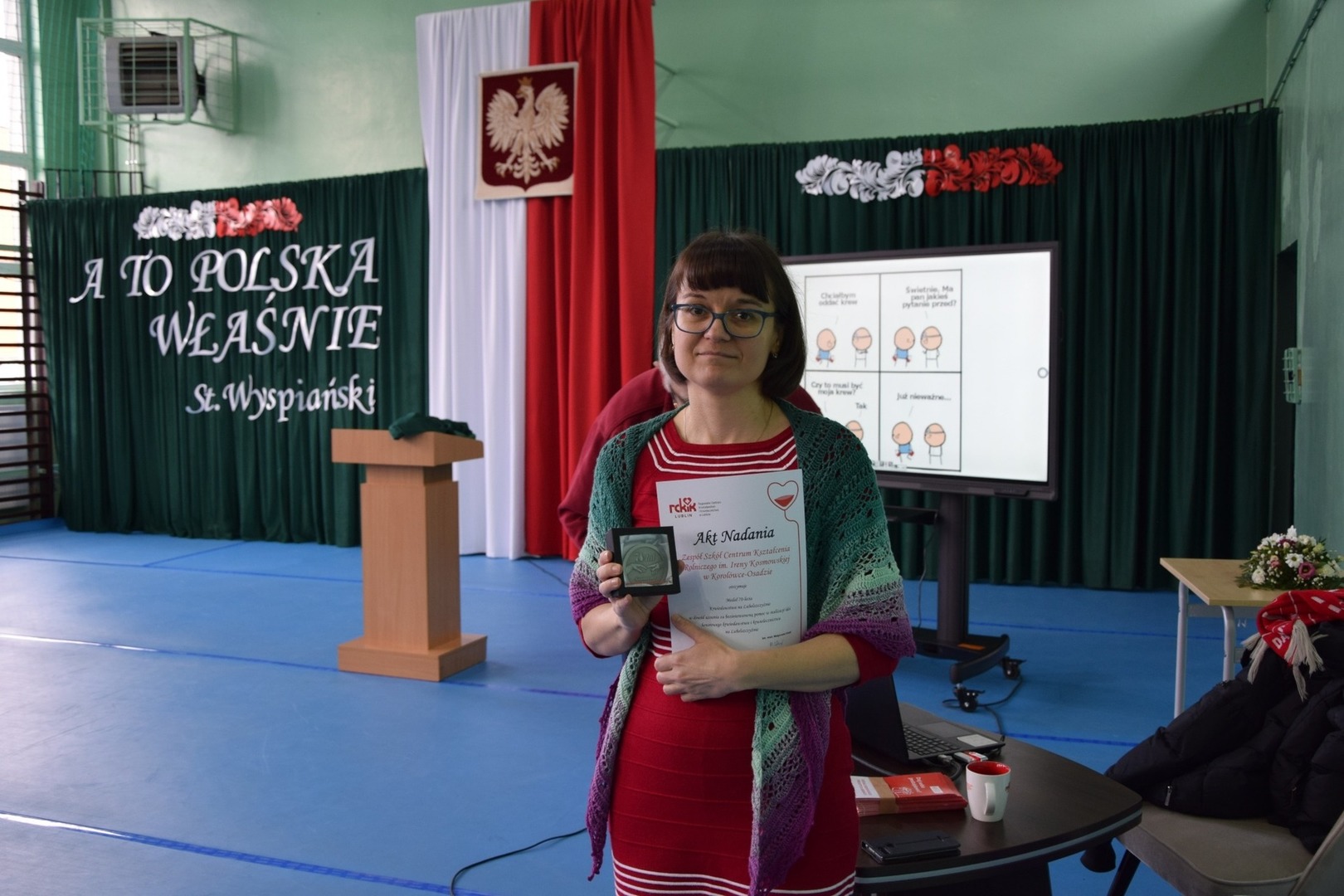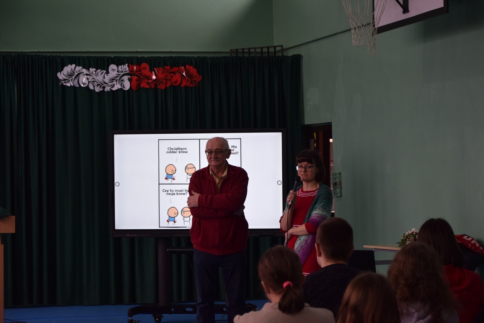 Na wstępie spotkania Pan dr Tajchert przekazał naszej szkole Akt Nadania Medalu 70-lecia Krwiodawstwa na Lubelszczyźnie oraz wręczył medal.