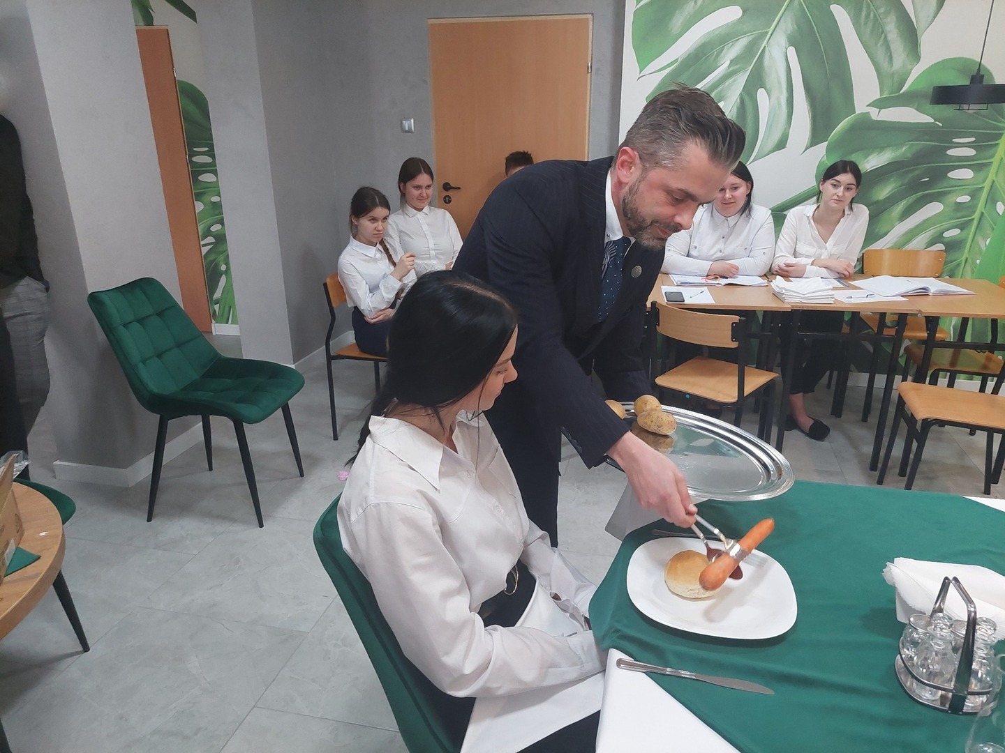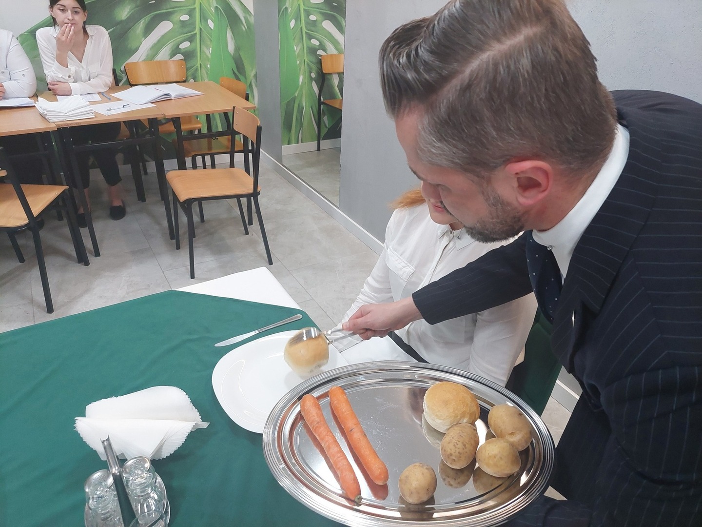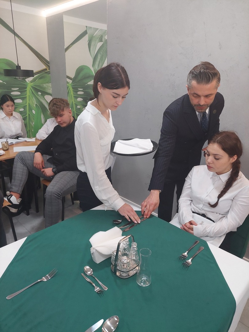 - Technika serwowania potraw i napojów - zasady ogólne serwowania i podawania uwzględniające czynności wykonywane z lewej i prawej strony konsumenta, technika noszenia zastawy stołowej (tace, talerzyki, półmiski, sztućce), zasada zbierania naczyń ze stołu, technika dokrywania sztućców do poszczególnych dań w obecności gościa, technika i zasady podawania przekąsek, zup, dań głównych i deserów, rodzaje serwisów – metoda niemiecka / francuska / angielska / rosyjska ze szczególnym omówieniem metody francuskiej wraz z ćwiczeniami praktycznymi;
