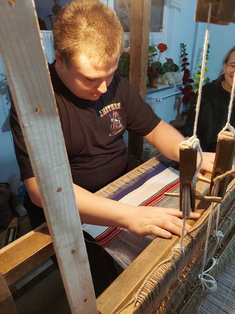 Na dzisiejszych zajęciach przy krosnach uczestnicy pod czujnym okiem tkaczki