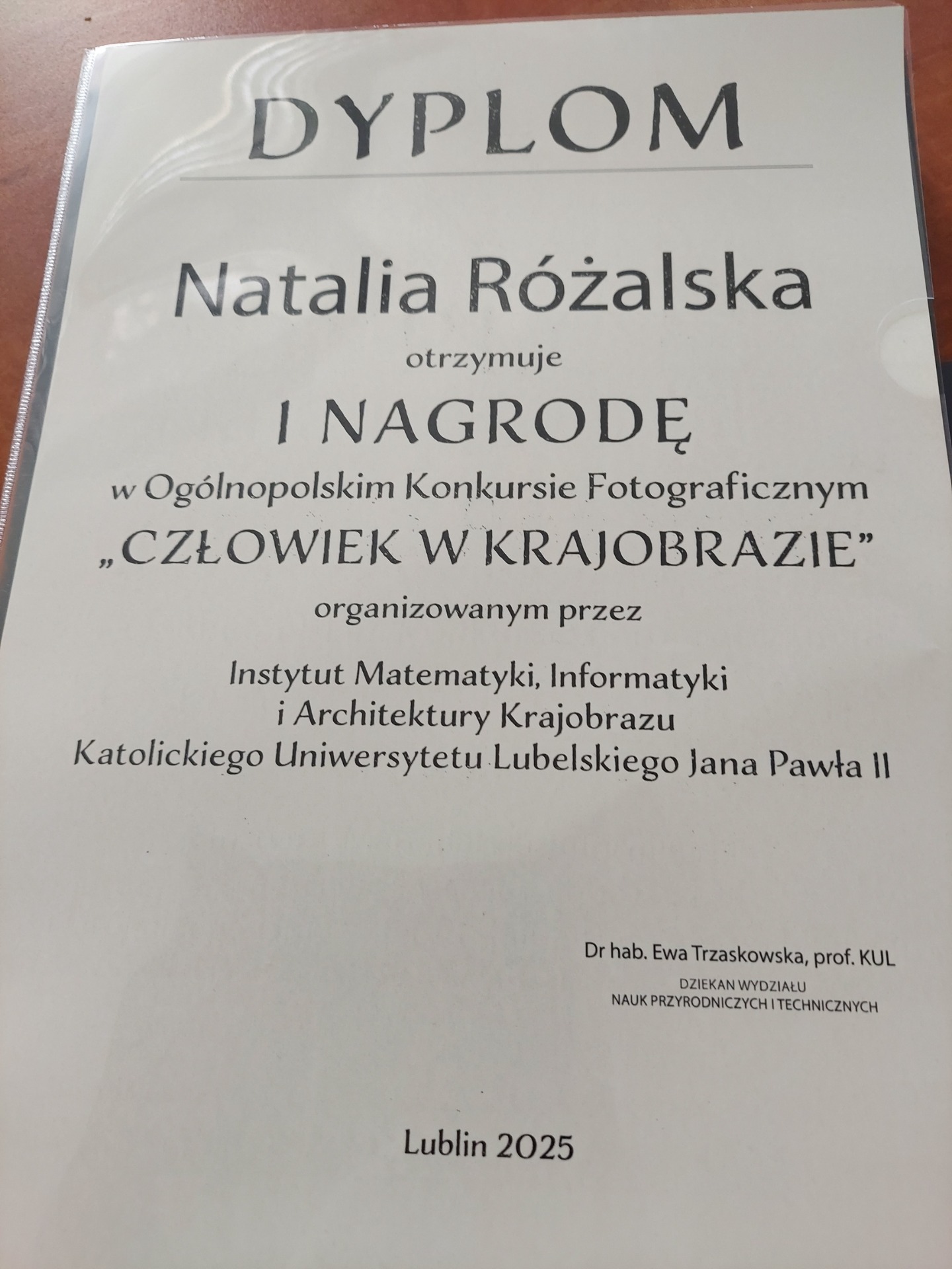 Miło nam poinformować, że uczennica klasy 2 PTM Natalia Różalska zajęła I miejsce w Ogólnopolskim Konkursie Fotograficznym „Człowiek w krajobrazie” organizowanym przez Instytut Matematyki, Informatyki i Architektury Krajobrazu Katolickiego Uniwersytetu Lubelskiego Jana Pawła II w Lublinie.